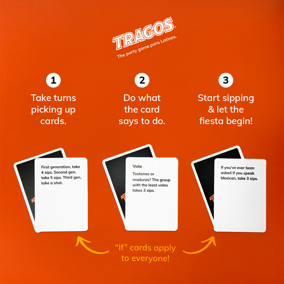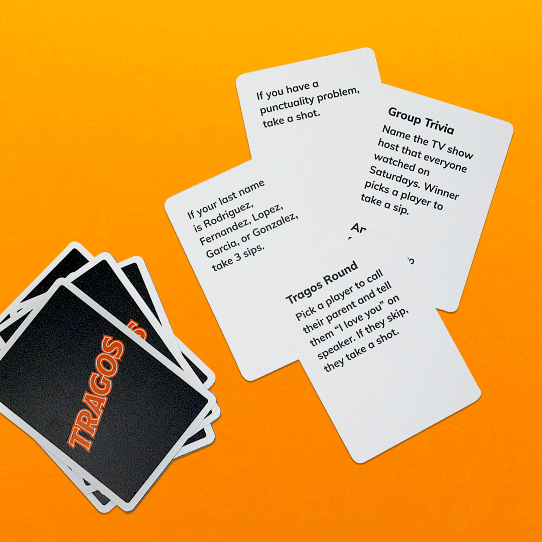 Full of Latino cultural references, Tragos card games embrace our traditions, and customs while poking fun at our stereotypes. Pick up a card on your turn and let the fun begin! Play with any beverage pero if you play with alcohol, drink responsibly!