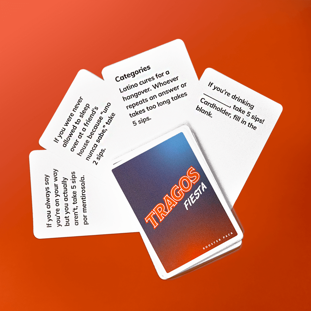 Full of Latino cultural references, Tragos card games embrace our traditions, and customs while poking fun at our stereotypes. Pick up a card on your turn and let the fun begin! Play with any beverage pero if you play with alcohol, drink responsibly!